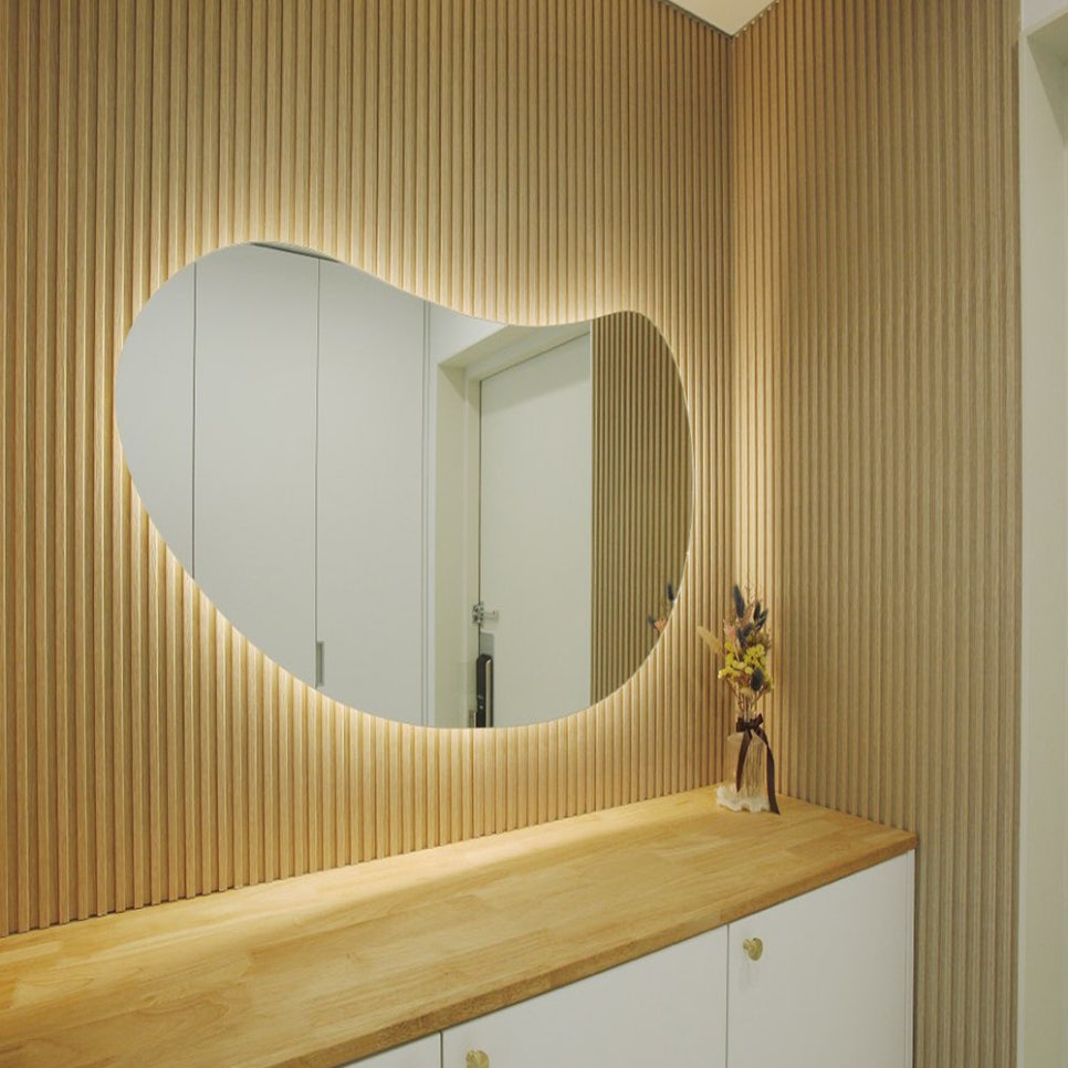 둥근 형태나 곡선 라인의 거울인테리어현관이 특히 어울립니다.