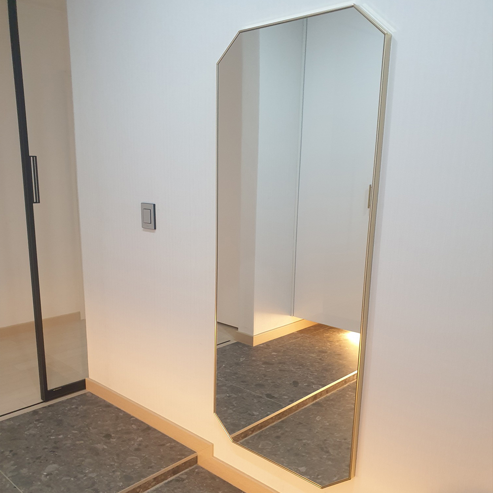 은은한 골드빛 현관거울는 공간을 고급스럽게 비추면서