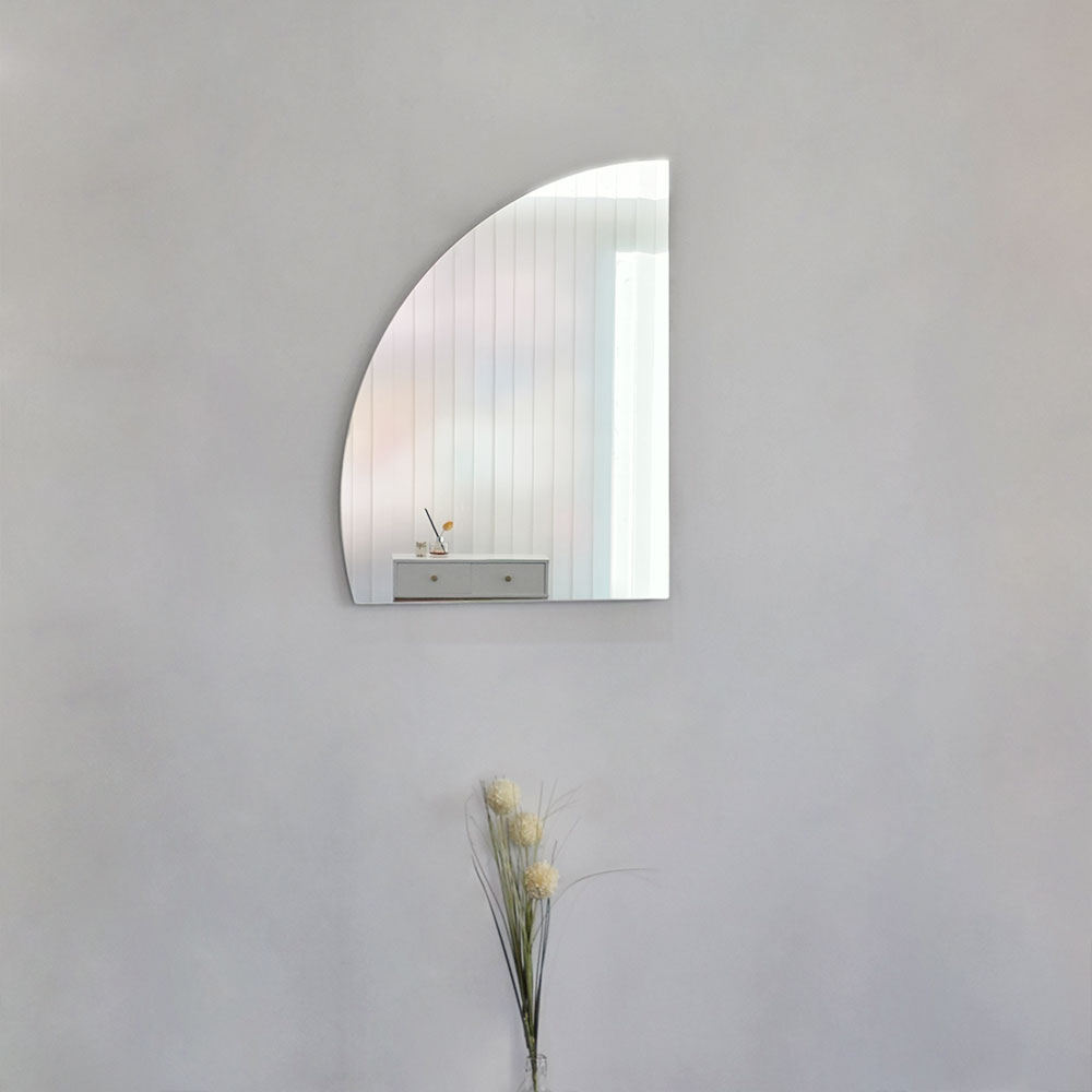 프레임 없이 형태만 남긴 반아치 비정형 거울은 작은 포인트 하나로도 벽의 인상을 부드럽게 채워주죠.