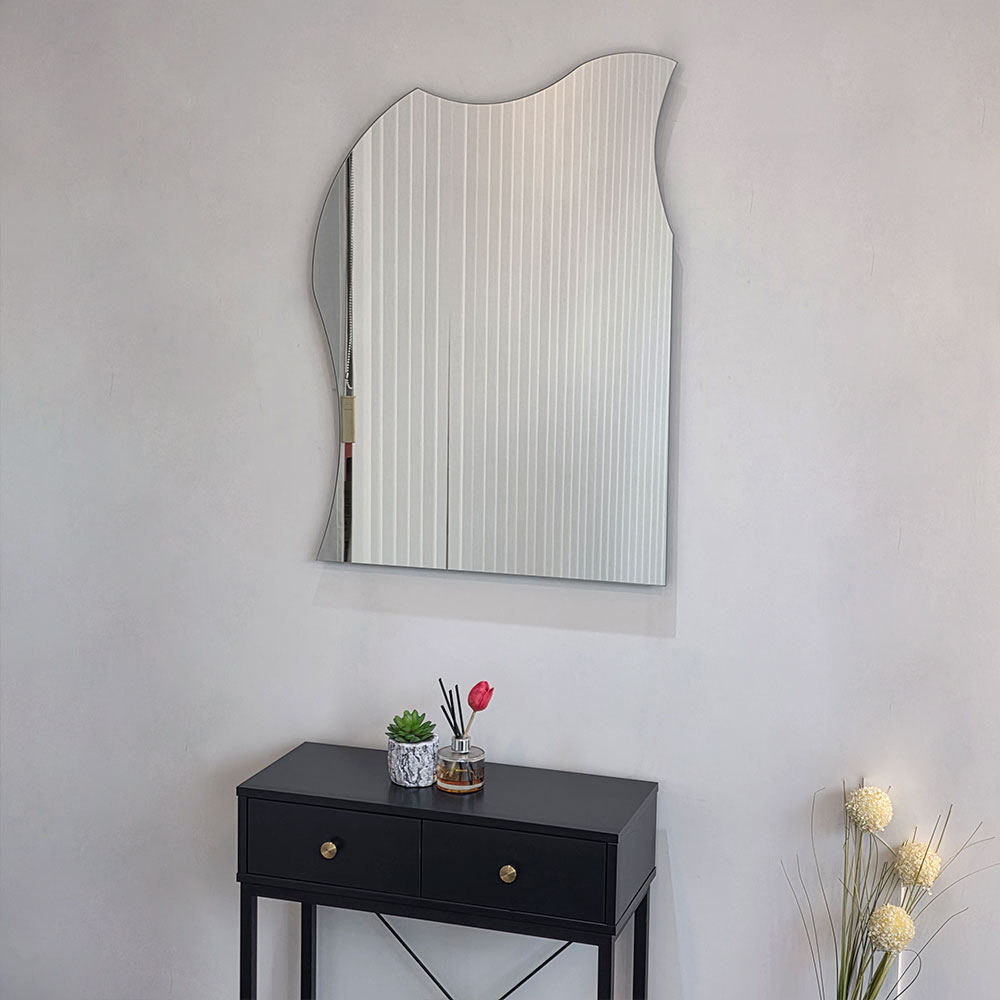 베아 비정형 거울의 상단 라인은 빈 벽 공간을 더 길게 느껴지게 만들며,