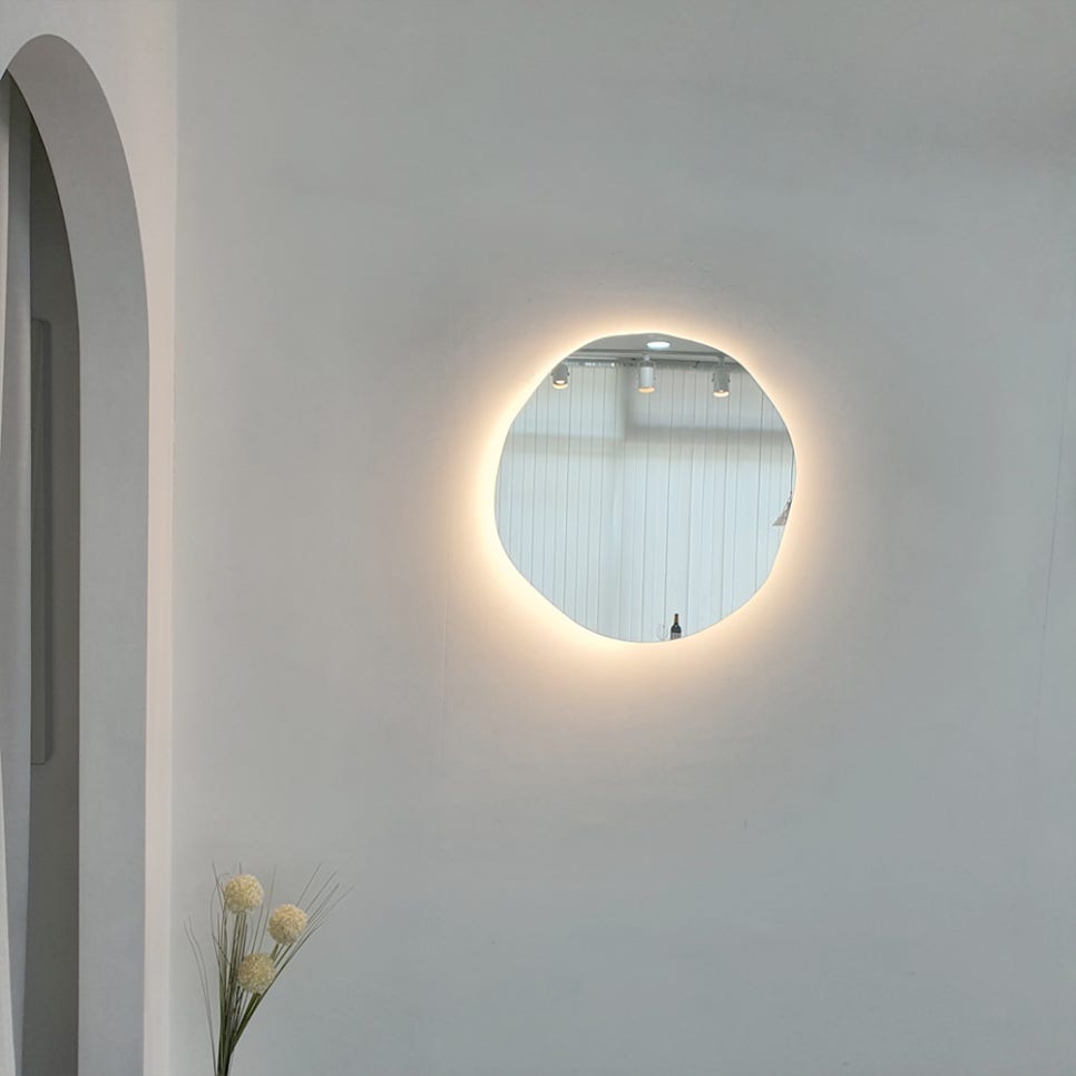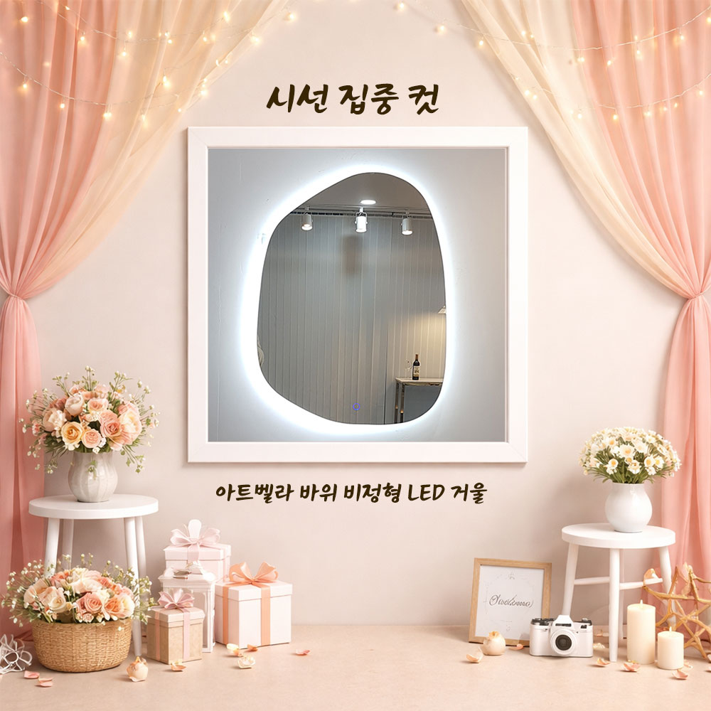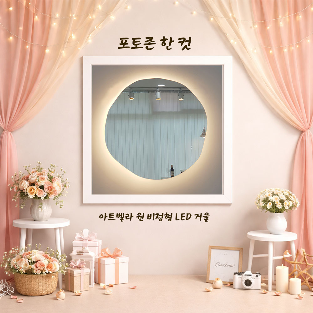 포토존비정형조명거울처럼 형태 자체가 분위기를 만드는 아이템이 잘 어울립니다.
