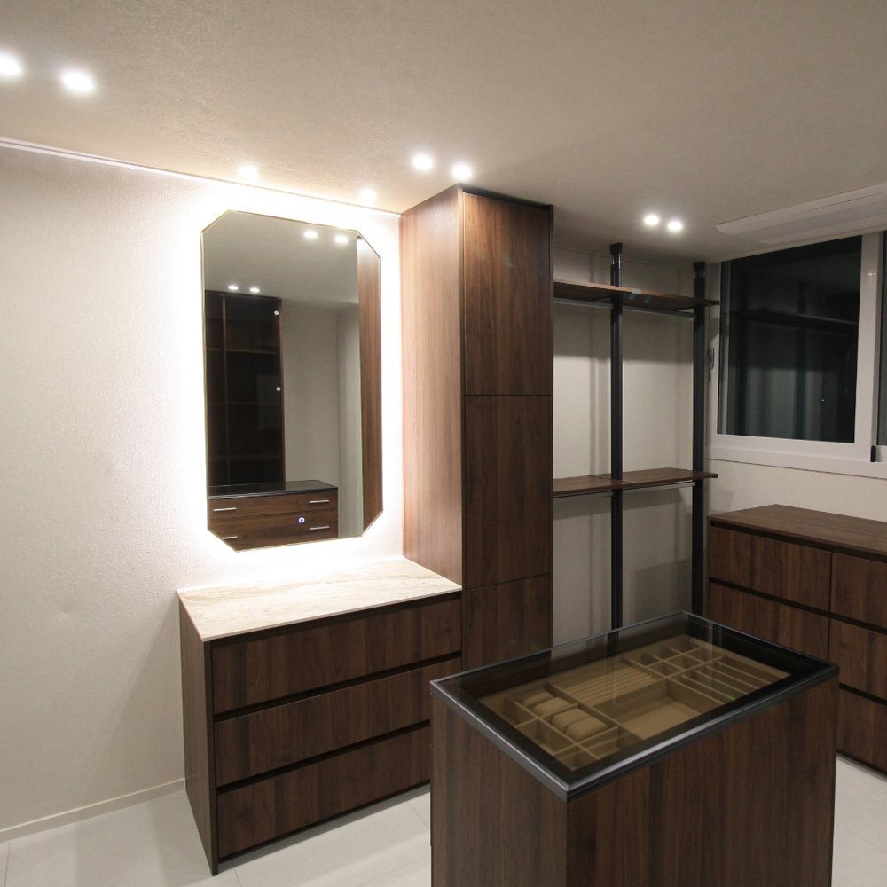 주거 공간: 대형 아파트나 주택에서는 욕실뿐 아니라 드레스룸, 현관, 파우더룸에도 간접조명거울을 확장 설치합니다.